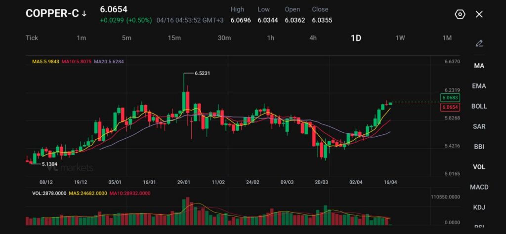 • Copper-C 報 6.0654,上漲 0.0299(+0.50%),盤中一度觸及 6.0696。(Copper-C:銅的差價合約/報價代號,屬於金融交易商品)