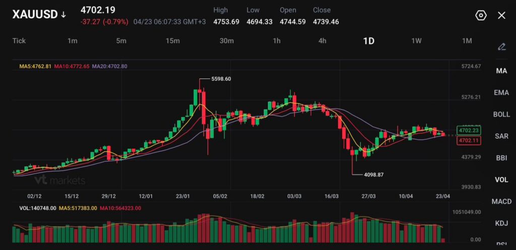 XAUUSD(黃金兌美元報價)在 4702 附近交易,小幅走弱。價格先前從 4098 低點反彈後形成底部,但目前在短期壓力下轉為橫盤整理,上漲動能開始減弱。
