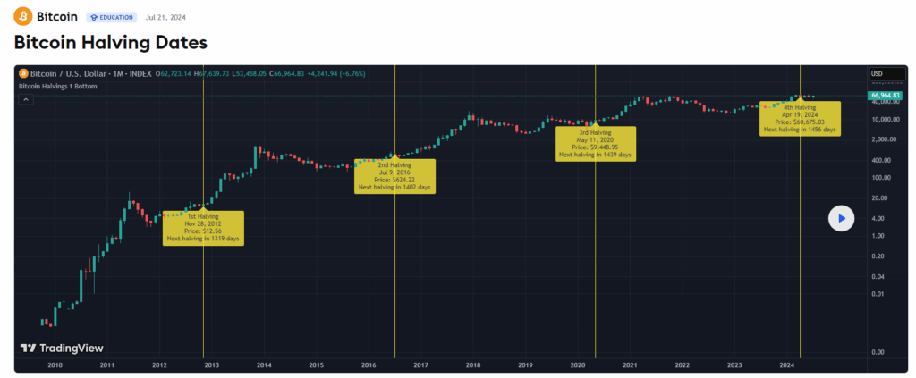 下圖追蹤了比特幣從2012年到2024年的減半歷史,顯示每次區塊獎勵減少都會導致價格大幅上漲。值得注意的是,每次減半後的12-18個月內,價格上漲往往會加速,然後在下一個週期開始前出現明顯的回檔。
