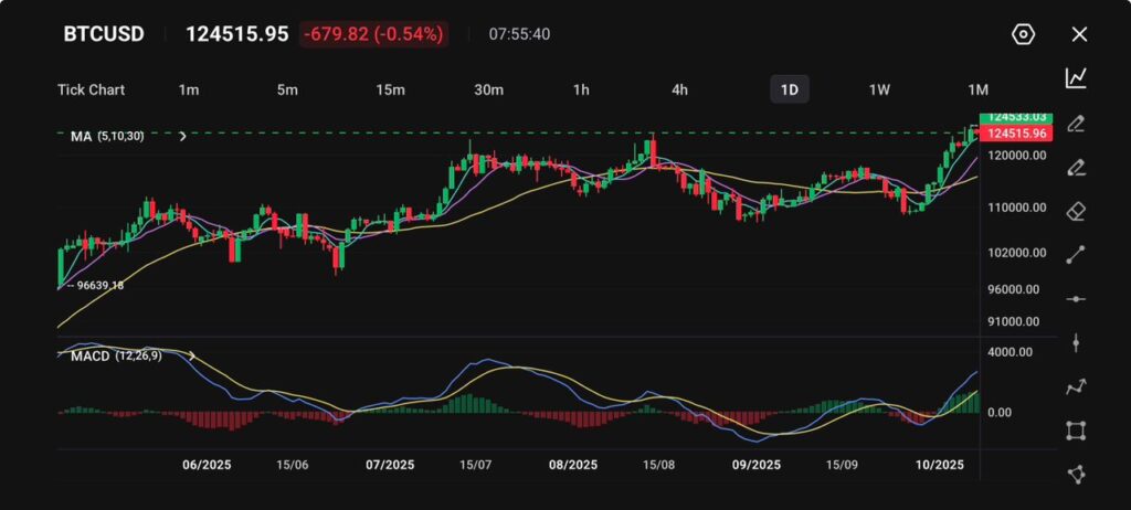 截至 2025 年 10 月初,比特幣交易價格約為 124,500 美元,經過數月的穩定累積和機構流入,繼續徘徊在歷史高點附近。