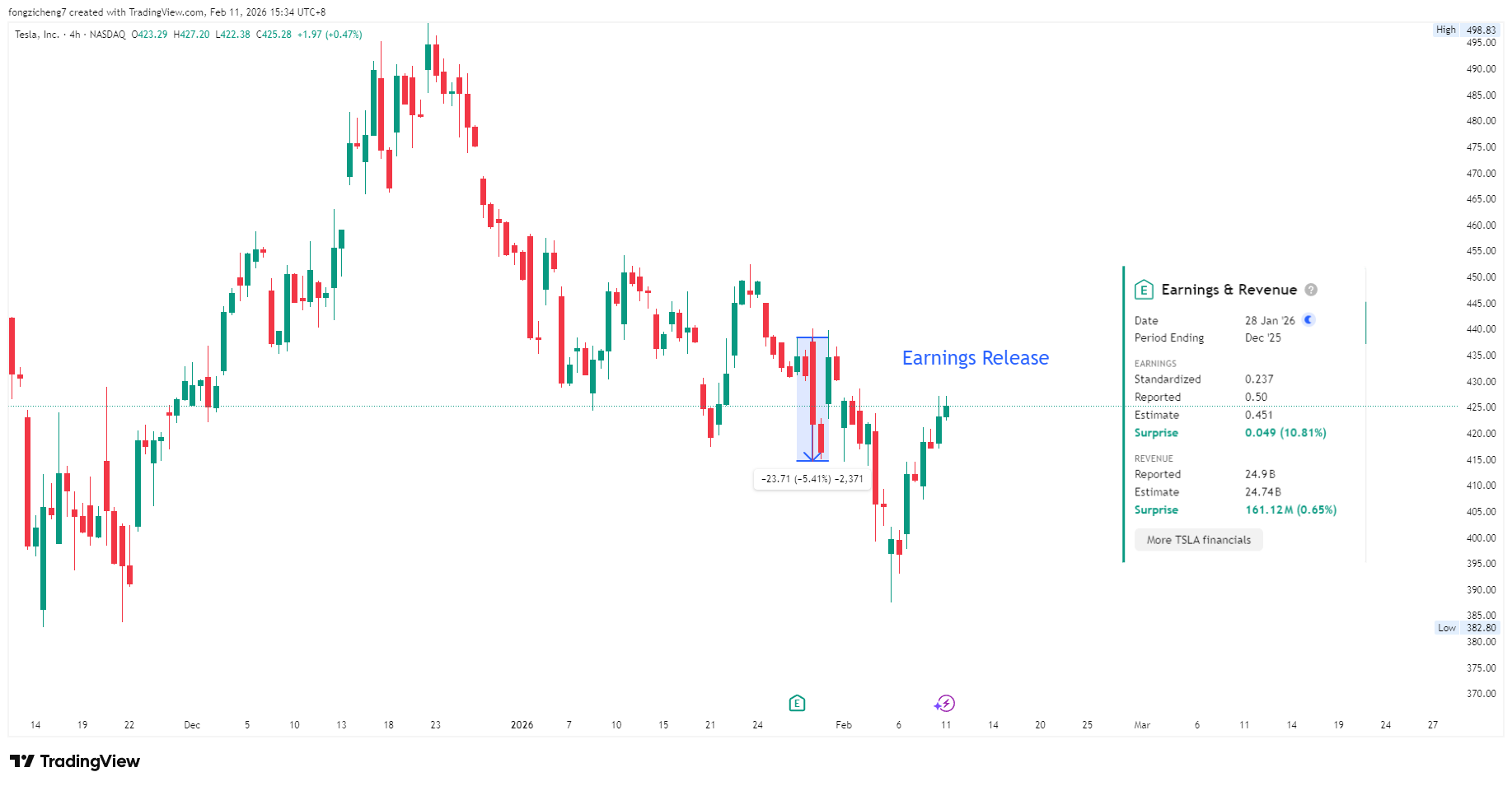 特斯拉的獲利超出預期 10% 以上,但財報發布前後幾個交易日,股價卻下跌了約 5%。