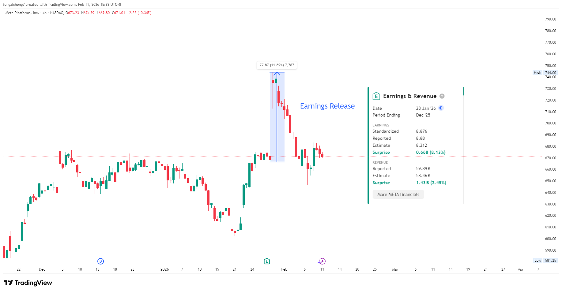 Meta股價在公佈獲利超出預期8%且營收也強於預期後,最初飆升近12%。然而,漲勢迅速消退,股價在幾天內回落至接近財報發布前的水平。