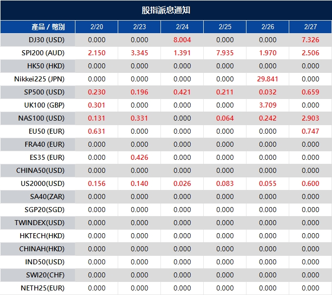 尊敬的用戶: 您好! 溫馨提醒您,在股指現貨中的成分股產生股利,分紅時,VT Markets 將於派息日前一天收盤後,對持有該股指產品的賬戶進行派息的費用扣補。 請務必留意,目前派息調整(Dividend)已「不再」與 持倉利率(Overnight Financing)合並計算在調期庫存費率(Swap)中。完成派息後,投資者可在賬戶歷史中查看到包含有以下注釋「Div & 股指名稱 & 凈手數 」的資金扣補記錄,即為派息調整,其中多單手數以「正值」計算,空單手數以「負值」計算,兩者相加即為「凈手數」。 VT Markets 股指產品隔夜倉息變化具體調整內容如下: 注意:以上數據僅供參考,實際執行數據有可能會有變動,具體請依據 MT4/MT5 軟件為準。 如您有任何疑問,我們的團隊將十分樂意為您解答。請留言或發郵件至 …