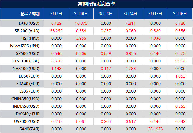 Please note that the dividends of the following products will be adjusted accordingly. Index dividends will be executed separately through a balance statement directly to your trading account, and the comment will be in the following format “Div & Product Name & Net Volume ”.