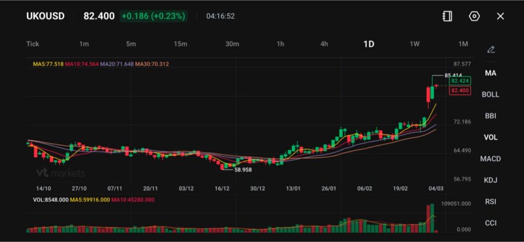 Oil prices remain elevated, with UKOUSD (Brent Crude) trading near $82.40, holding close to recent highs after a strong rally from the December low around $58.96. The broader daily structure shows a clear bullish trend, supported by a sequence of higher highs and higher lows since the start of the year.