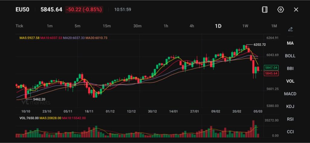 European equities weakened again on Thursday, with the EU50 index falling to 5845.64, down 50.22 (-0.85%). The decline follows a brief pause in selling on Wednesday as traders reassessed rising energy prices and the broader implications for Europe’s inflation outlook.