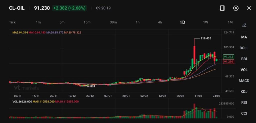 WTI crude is trading near 91.23, up +2.68%, while Brent crude has climbed back above $100 per barrel, reversing earlier losses. The rebound follows a short-lived relief rally that faded quickly as geopolitical tensions intensified.