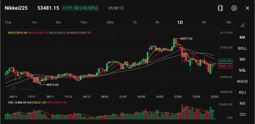 Japan’s Nikkei 225 rallied strongly on Wednesday, advancing 2.93% to 53,784.43, as markets responded to a drop in oil prices and signs that geopolitical tensions may ease.