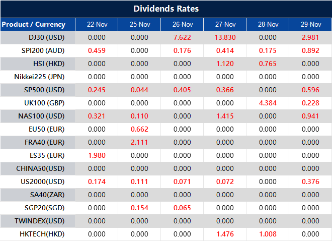 Please note that the dividends of the following products will be adjusted accordingly. Index dividends will be executed separately through a balance statement directly to your trading account, and the comment will be in the following format “Div & Product Name & Net Volume ”.