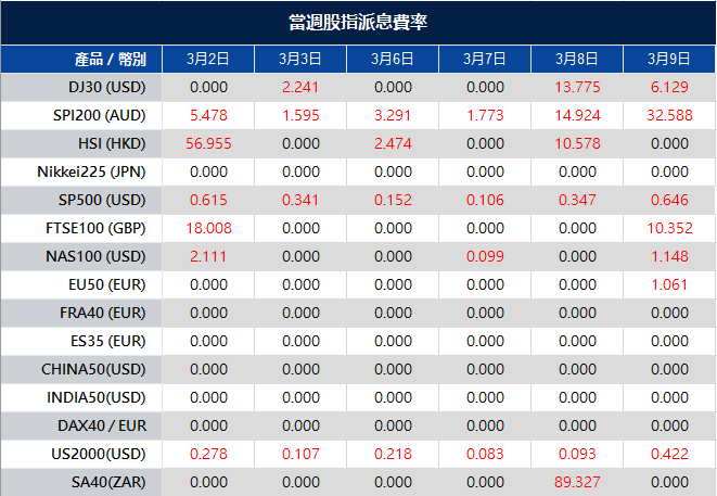 Please note that the dividends of the following products will be adjusted accordingly. Index dividends will be executed separately through a balance statement directly to your trading account, and the comment will be in the following format “Div & Product Name & Net Volume ”.