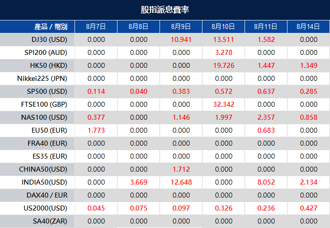 Please note that the dividends of the following products will be adjusted accordingly. Index dividends will be executed separately through a balance statement directly to your trading account, and the comment will be in the following format “Div & Product Name & Net Volume ”.