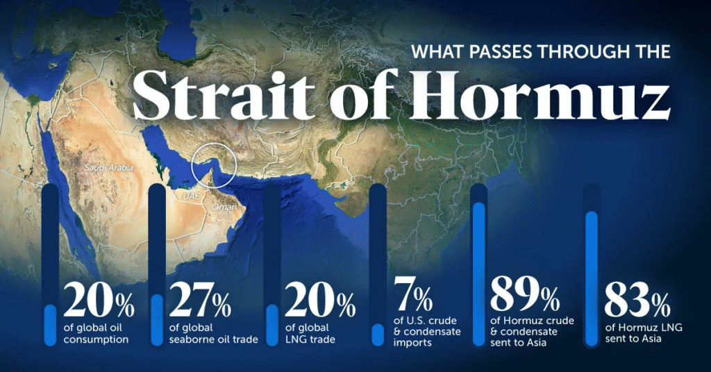 The Strait of Hormuz handles roughly 20% of global oil consumption, alongside a significant share of liquefied natural gas flows, particularly from Qatar. Any disruption here does not gently move markets. It forces a repricing.
