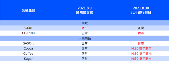 Please note that adjustment on following products due to National Women’s Day and August Bank Holiday.