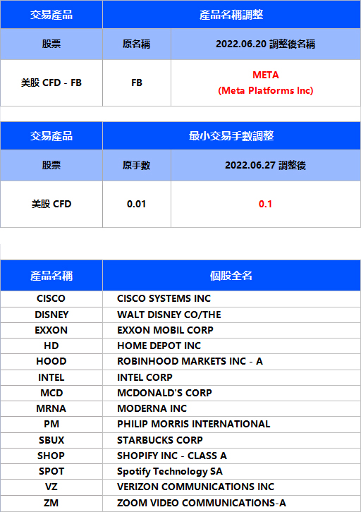 2. From June 20, the name of the US stock CFD product FB will be adjusted to META, and the full name will be adjusted to Meta Platforms Inc.