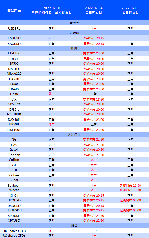 The above time is MT4/5 server time. The trading time of other products is not affected. The above data may be subject to change. Please refer to the actual time on MT4/5.