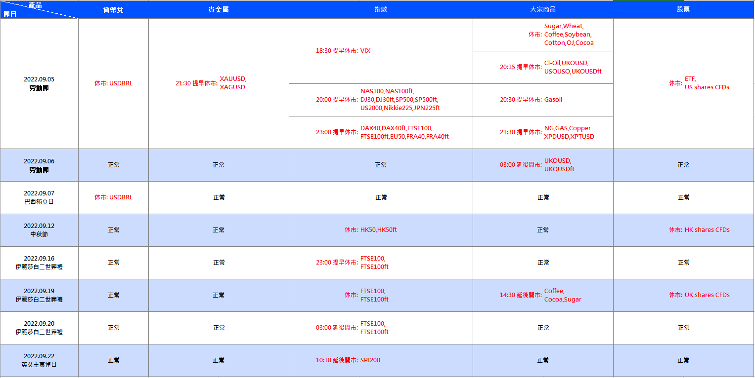 Please note the adjustment on the following products due to the international holiday in September: