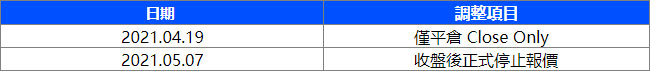 溫馨提醒您,所有未平倉的 TW50 倉位,將於2021年05月07日收盤前一個小時 (系統時間 22:45) 由系統平倉。請務必留意相關的交易風險。