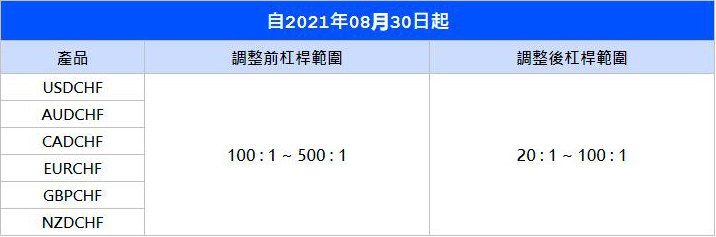 瑞士央行近期持續透過匯市幹預的舉措,試圖減緩瑞郎進一步的上漲。瑞郎系相關貨幣兌的交易風險也隨著幹預力度的增加而提高,VT Markets 為了保障旗下客戶都能在穩定的市場環境下進行交易,我們將於 2021年8月 30 日調降所有瑞郎系貨幣兌的杠桿範圍,具體調整內容如下: