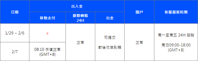 3、節假日期間,2022年1月29日~2022年2月6日,入金服務正常,僅暫停支付寶入金服務,並於2022年2月7日恢復正常;