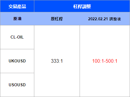 1. 所有原油產品由原先固定杠桿333:1調整為100:1-500:1 (依賬戶杠桿浮動)生效時間(系統時間 GMT+2):2022 年 02 月 21 日 00:00