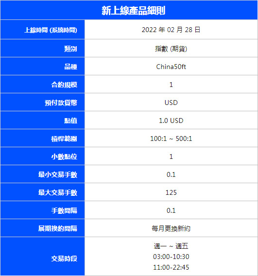 VT Markets 為進一步豐富廣大客戶的投資選擇,我們預計將於 2022 年 02 月 28 日(周一) 新增 1 只合約:China50ft