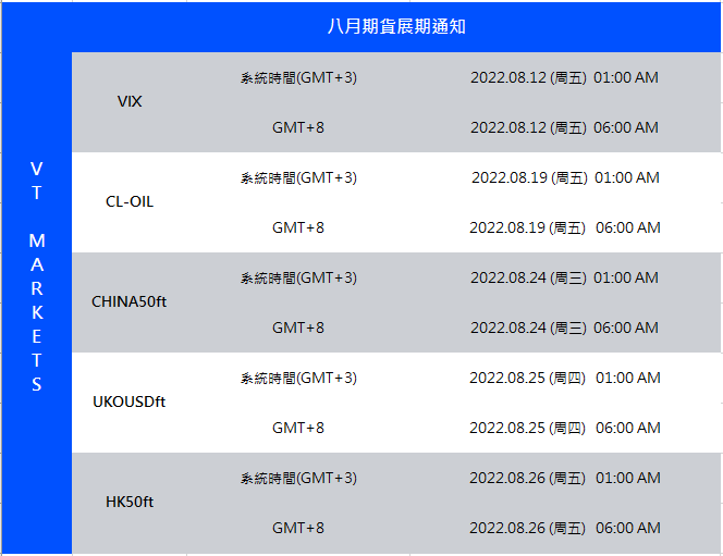 VT Markets 平台的期貨產品:VIX(波動率指數)、CL-OIL(原油期貨)、CHINA50ft(新華富時50期貨)、UKOUSDft(布蘭特原油期貨)、HK50ft(香港恒生50期貨) 即將於以下時間展開新合約,如持倉過夜將會收取展期費用。